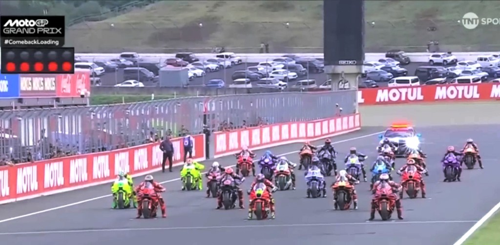 No, it’s not Formula One. It’s MotoGP! Compared to MotoGP, Formula One is like watching grass grow. MotoGP is the Grand Prix of motorcycle racing. There are four official classes, one being electric; the top gasoline class is the only one I watch.